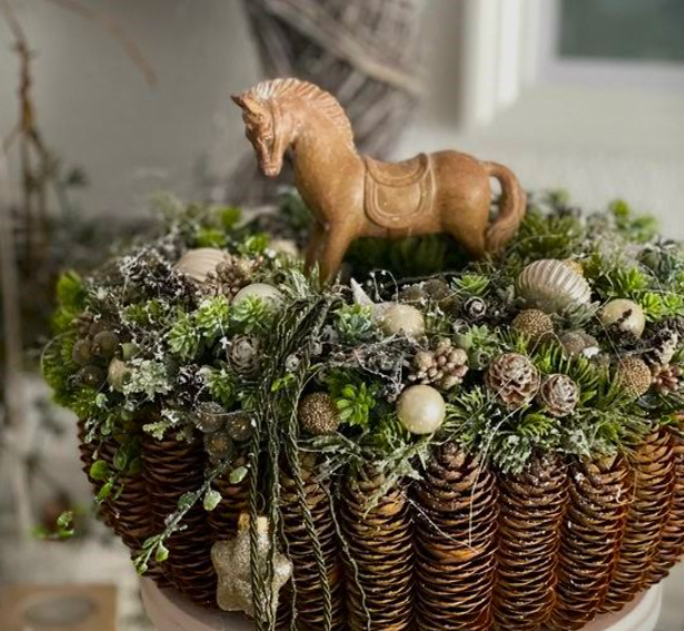 Deze workshop staat helemaal in het thema van kerst. Je maakt een ondergrond van dennenappels door deze aan elkaar te binden. Zo heb je de basis van het kerststuk gemaakt. Vervolgens zit binnenin oasis waar je het kerststuk verder opmaakt.